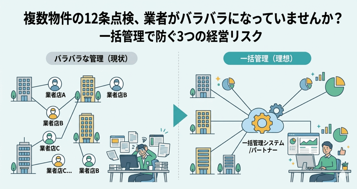 今回は、複数物件をお持ちの所有者様・管理者様・総合管理ご担当者様へ向けて、12条点検を物件ごとの個別対応で終わらせず、全体で整理するメリットをご紹介します。