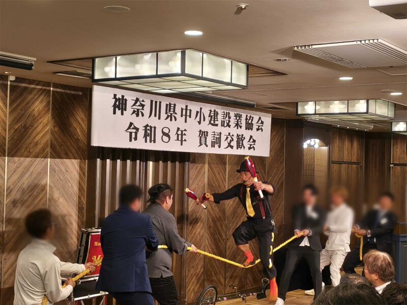 綱を引っ張った上にパフォーマーの方が乗るという難しい芸でしたが、副社長の力強いサポートもあり、見事に成功しました。